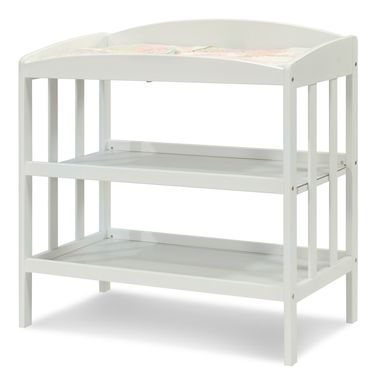 Sleek styling for today?s modern nursery, the Monterey Changing Table in a fresh white finish by DaVinci will meet all your changing and dressing needs and look great doing it. Metal supports give extra security under the changing pad and a safety strap is included to keep your baby safe while on the changing top. The two shelves below can be used for storing diapers, extra clothing, ointments and lotions. This table?s durable construction makes it possible to continue use after diapers as a display space or bookcase.