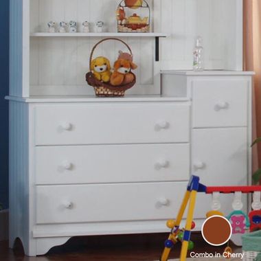 Coastal charm resonates throughout the Nantucket Combo, featured in Cherry, from Eden Baby. Featuring four shelves, three on the left and one on the right, as well as, a door on the left housing a single shelf, the storage options with this combo dresser are limitless. All of the drawers also feature dove-tail joints for added strength and durability. The classic bead board detailing on the side panel echoes the beauty of a coastal retreat while the rich Cherry finish adds warmth to any room. Sold Separately: - Changing Pad