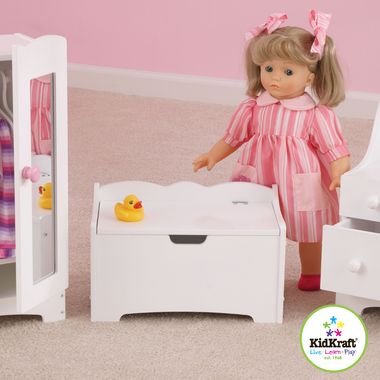 Toy boxes are fun especially when it is the KidKraft Lil Doll Toy Box. This pretty KidKraft design has a pearl White finish on sturdy composite wood and the design features a lovely scalloped border. It also has a safety hinged lid and air vents just like a big toy box. The KidKraft Lil Doll Toy Box is a wonderful addition for every little girl's doll collection.