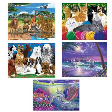 • Set includes: (100pc) Dolphin Cover Puzzle, (200pc) Picture Purr-fect Puzzle, (200pc) Fetching Friends Puzzle, (300pc) On the Savannah Puzzle, (500pc) Seaside Stallions Puzzle